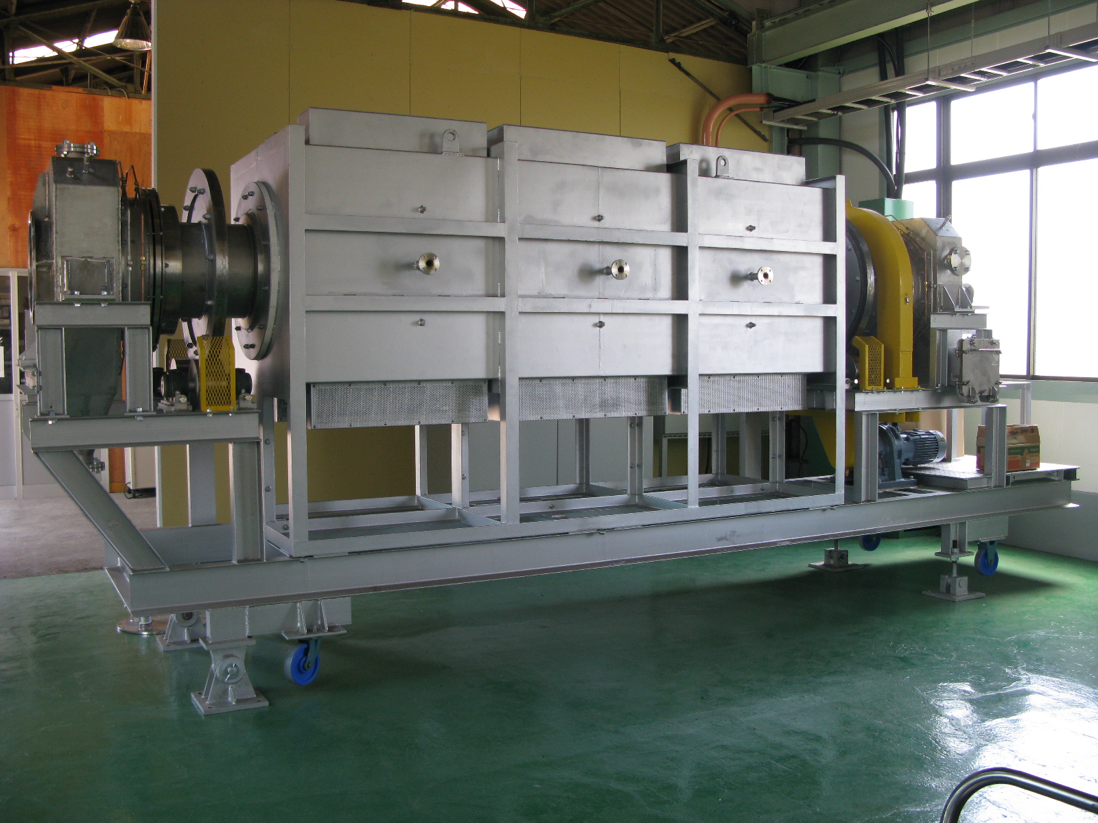 This machine is an indirect heating type of rotary kiln using ceramics for the retort material. Introducing the ceramic retort enables continuous heat treatment at a high temperature (approximately 1500oC) for nonmetallic materials to produce stable and high quality products.