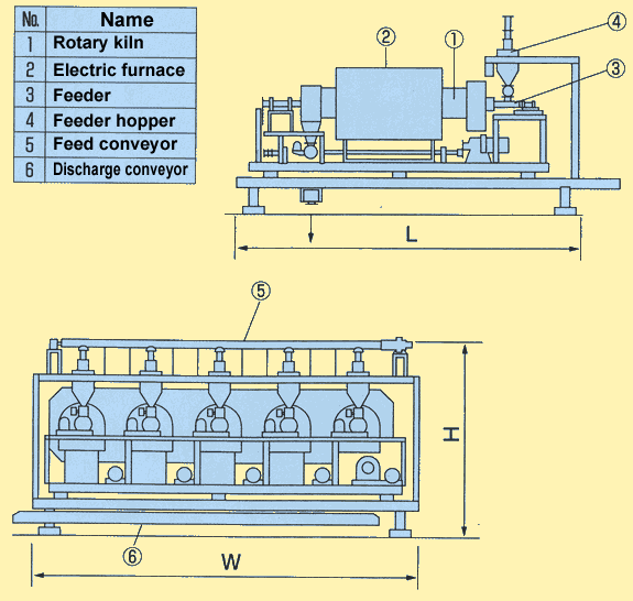 | Type | Capacity (kg/Hr) | Number of retorts | Electric furnace capacity (kW) | Total length L (mm) | Total width W (mm) | Total height H (mm) |